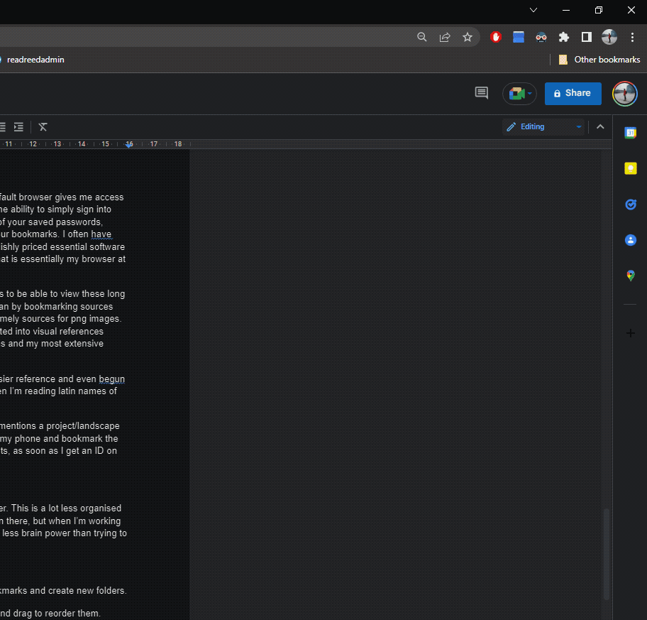 It starts with using Google Chrome. Having Chrome as my default browser gives me access to my Google account and all the benefits that come with it. The ability to simply sign into your Google account from any device and have access to all of your saved passwords, extensions (AdBlocker and DarkReader) and critically all of your bookmarks. I often have necessity to use the university computers to run some outlandishly priced essential software (Adobe I’m looking at you) and so having instant access to what is essentially my browser at home is an absolute treat.