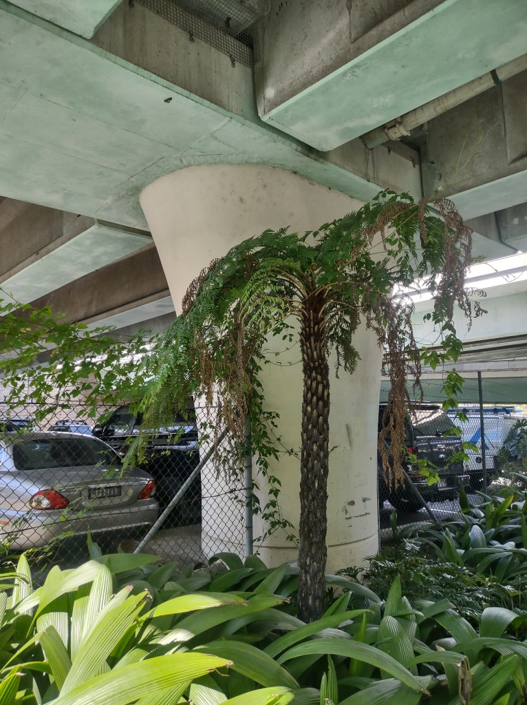 Three years early, a similar section of the riverfront had been upgraded. Now open to the public, the crafted landscape was well received and awarded. Resting my back wheel against a low, concrete wall, the tree-ferns again caught my eye. One appeared to be almost entirely dead; absent of any leaves and seemingly just an upright trunk. The next closest one had an unwanted vine already traversing the ferny fronds. My right hand (well acquainted with secateurs) itched. A couple of quick snips would save this plant.