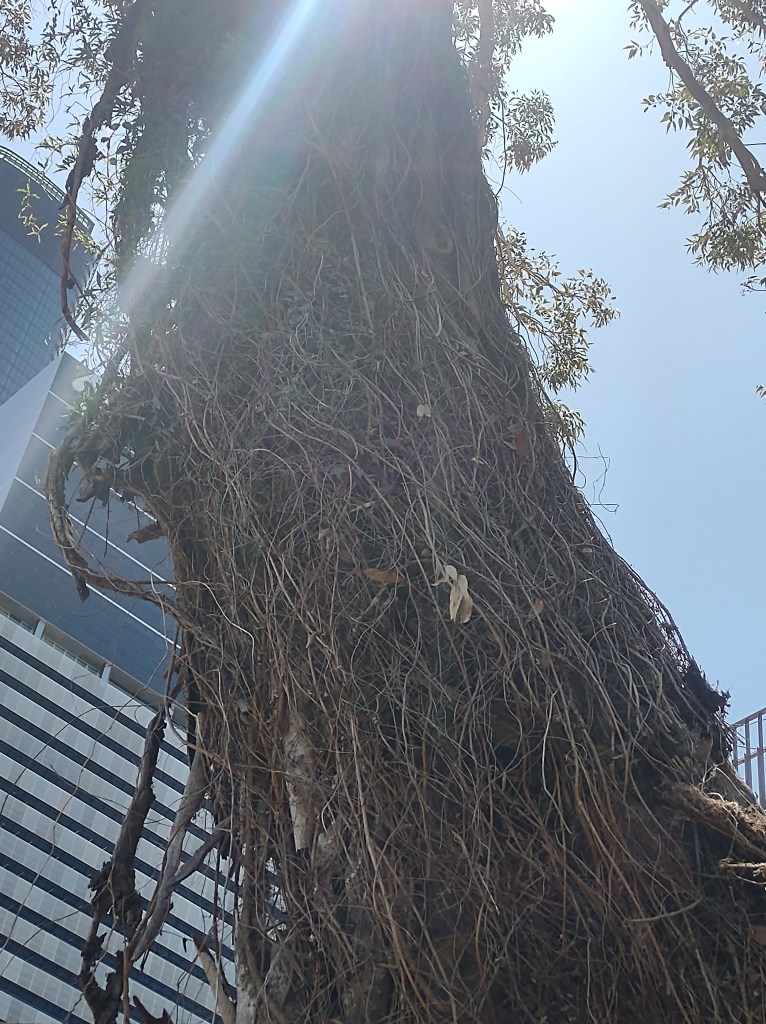 Decidedly late for my lecture, I mounted my bicycle again and cruised through the open Queens Wharf construction site. Virgin lawns surrounded by construction fences, dotted with tens of thousands of dollars worth of trees loomed mere metres from the dying Eucalypt. Rigorously cared for to ensure success, the new mature trees lacked the invasive weed slowly killing their riverfront brethren.