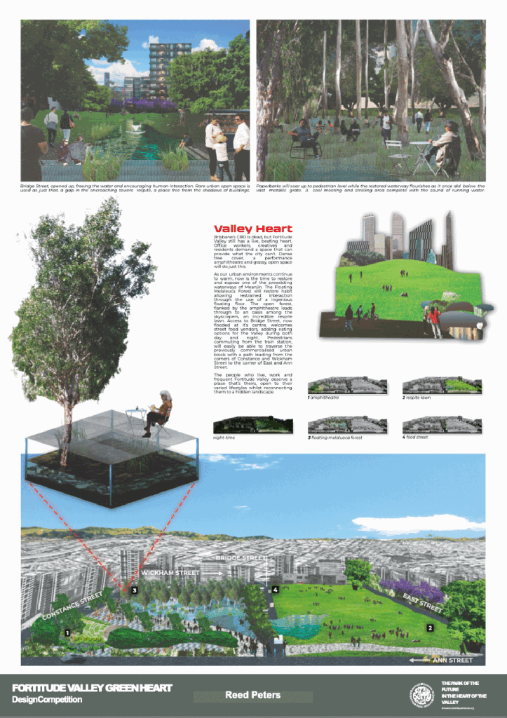 Strawberry Fields Parkland Project and Matthew Moore led a competition to design a park within the Heart of Fortitude Valley. As Brisbane continues to densify, there must be accompanying high quality greenspace and Fortitude Valley is already falling behind in this regard. The proposed site involved a reclaiming of privately owned car dealerships and a conversion to a public parkland. The site is in close proximity to a diverse array of users from office workers, to residents whilst also holding hands with Brisbane’s primary nighttime entertainment district.